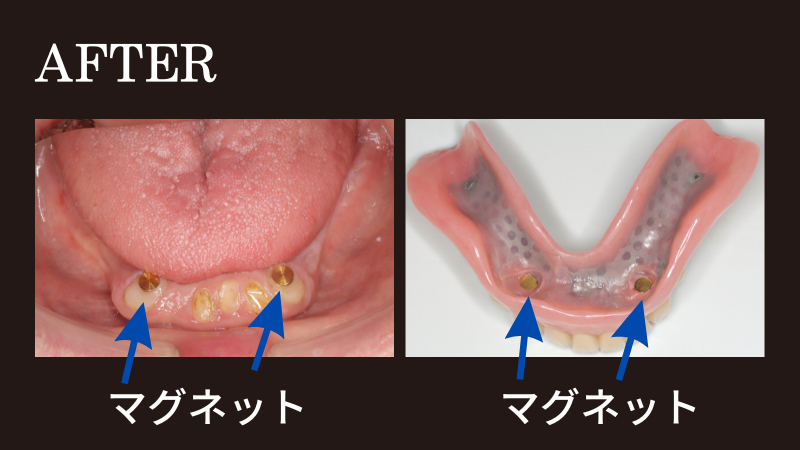 しっかりと安定させるために、入れ歯の裏側にマグネットを取り付けて、磁石の力でも入れ歯を維持しています。