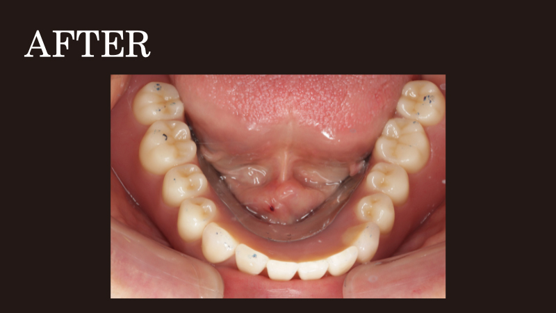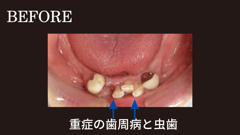 残っている数本の前歯は、虫歯や歯周病が進んでおり、入れ歯を支えるには弱ってしまっていました。
