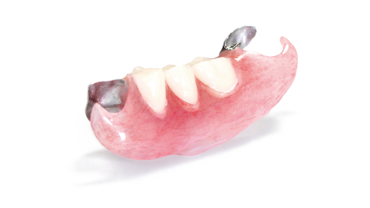 コンフォート入れ歯(コンフォート義歯)は、保険の入れ歯のような金属の留め具(クラスプ)ではなく、ピンク色の留め具を使った目立たない入れ歯。