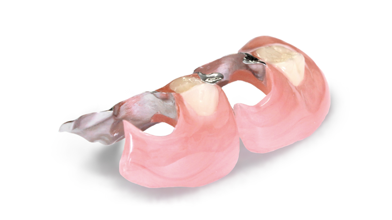 金属の代わりに、ピンク色の留め具を使っているため、保険の部分入れ歯に比べて目立ちません。