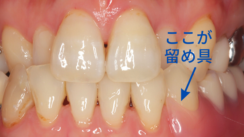 この写真は、右下に「金属床+ノンメタルクラスプ」が入っていて、矢印の部分が留め具です。
